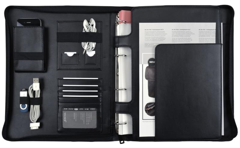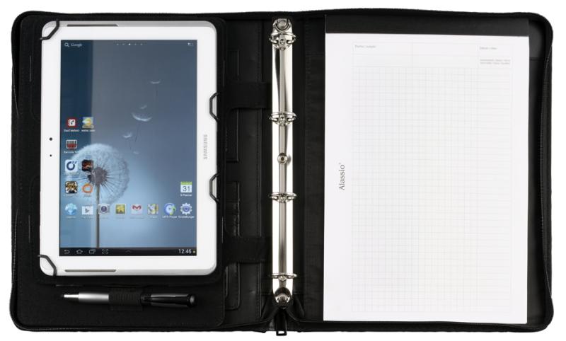 Artikelbeschreibung:Lederimitat, herausnehmbare universelle Tablet-PC-Hülle, Standfunktion: horizontal und vertikal aufstellbar, herausnehmbare Ringmechanik, inkl. Schreibblock, Maße: (B)275 x (T)40 x (H)335 mm