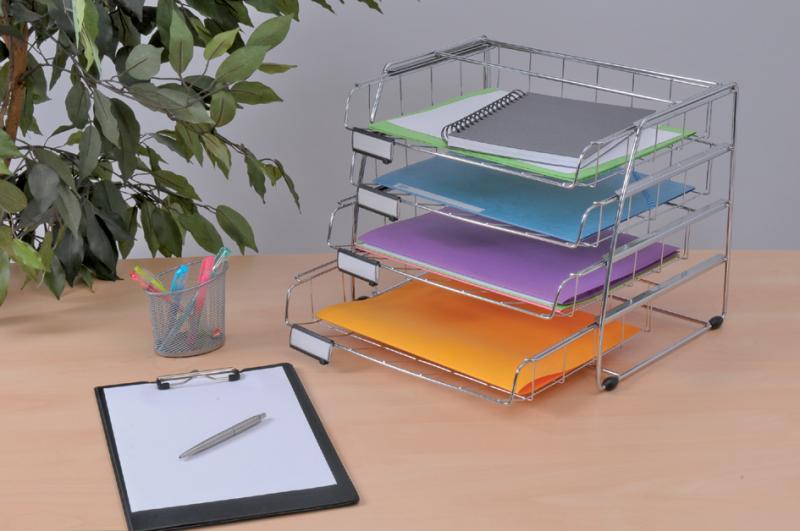 Artikelbeschreibung:für A4 - C4 Dokumente, inkl. 4 Etikettenhaltern und 2 Sets von rutschfesten Auflagenoppen, Struktur aus verchromtem Drahtmetall, Höhe eines Korbs: 65 mm, Produktabmessungen: (B)315 x (T)390 x (H)315 mm (COR4F)