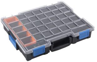 Artikelbeschreibung:Profi-Kleinteilekoffer mit Verschlussclips, individuelle Aufteilung durch herausnehmbare Trennstege, 12 Fächer, schließen fest mit Deckel ab, Deckel aus hochschlagfestem Polycarbonat, Maße: (B)440 x (T)355 x (H)76 mm