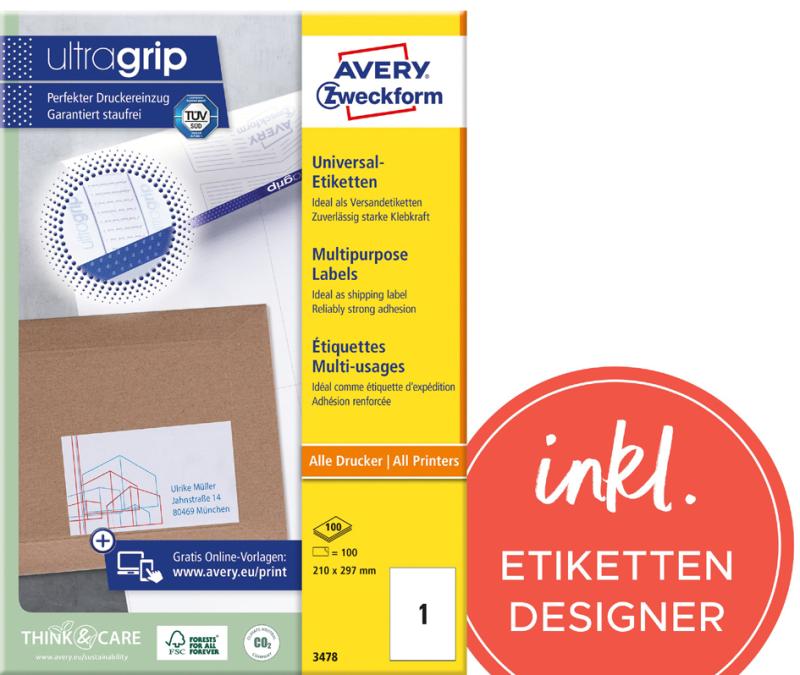 Artikelbeschreibung:mit ultragrip-Technologie, Rand an Kopf und Fuß, für Inkjet-, Laser-, Farblaserdrucker und Kopierer Inhalt: 1.200 Etiketten auf 100 Blatt A4 70,0 x 67,7 mm