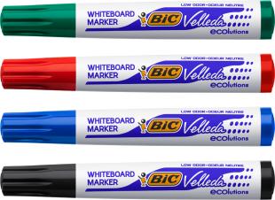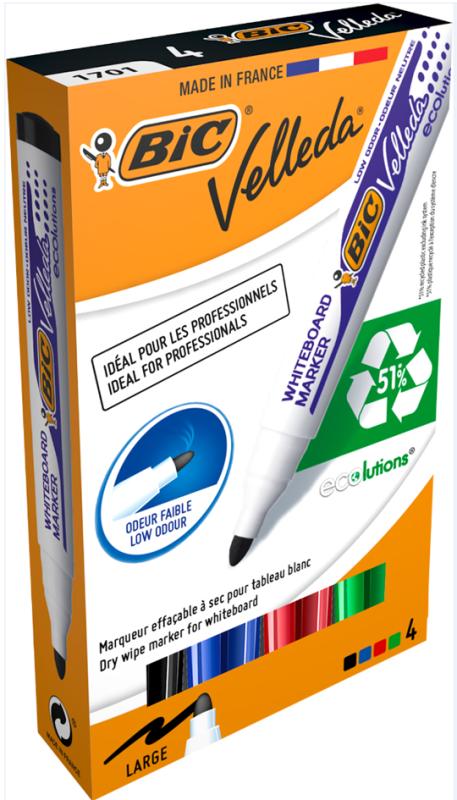 Artikelbeschreibung:Rundspitze, Strichstärke: 1,5 mm, Schaftfarbe: weiß, Kappe und Endstück in Strichfarbe, Kunststoffschaft ohne PVC, sortiert in den Farben schwarz, blau, rot und grün beinhaltet: 4 Marker (alt: 1199001704/ neu: 904941) trocken abwischbar, druckstabile Spitze, geruchsarm, aus 51 % recycletem Material