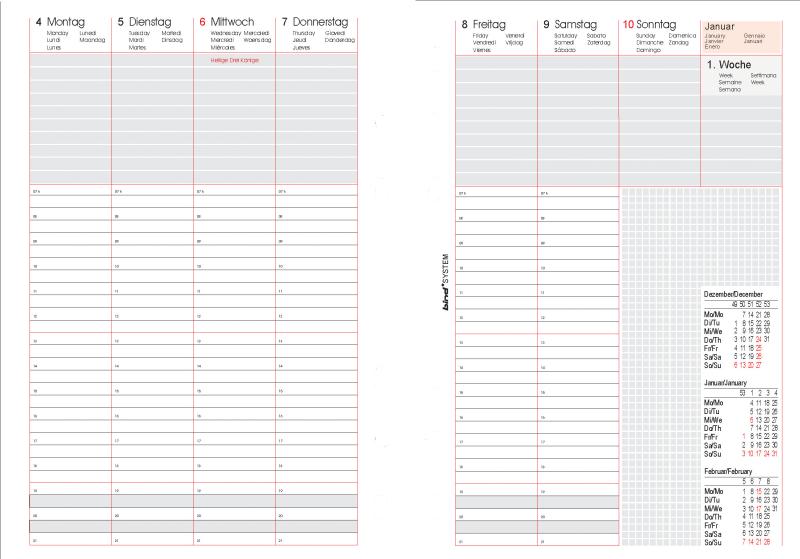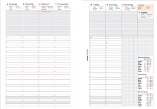 Artikelbeschreibung:15701/T3/T5/T55, Wochenkalender: 1 Woche auf 2 Seiten, inkl. Monatsübersicht, Druckfarbe: grau / schwarz / rot, 6-sprachig, 6er Lochung, Lochabstand: 13/13/59/13/13 (B250826)