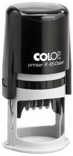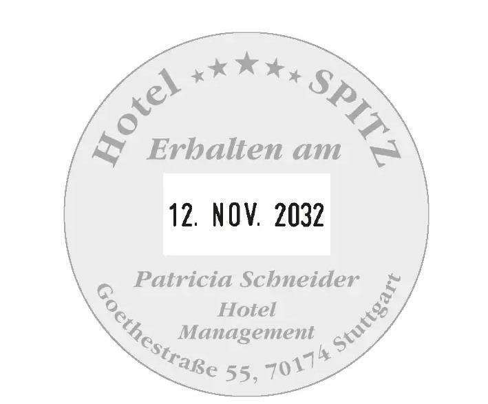 Artikelbeschreibung:inkl. Gutschein zur Anfertigung einer individuellen Textplatte, runder Abdruck, max. 8 Textzeilen, Abdruckgröße: Durchmesser 45 mm, Abdruckhöhe Datum: 3 mm, Monate in Buchstaben, inkl. Kissen schwarz passendes Ersatzstempelkissen: E/R45 Datum: deutsch