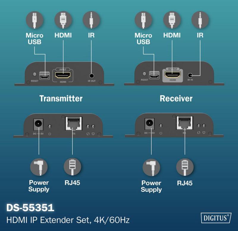 Artikelbeschreibung:für AV-Signalübertragung in UHD-Auflösung 4K/60 Hz, HDTV Auflösung max: 4.096 x 2.160 Pixel, HDTV Standard: Ultra HD 4K, Kategorie: CAT 6, Übertragungstechnik: IP, Maße 1 Einheit: (B)94 x (T)97 x (H)24 mm (DS-55351) Lieferumfang: 1x Sendeeinheit, 1x Empfängereinheit, 2x Netzteil, EU-Stecker, 2x IR-Kabel, 1x Bedienungsanleitung