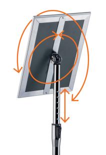 Artikelbeschreibung:Rahmen drehbar, verstellbarer Lesewinkel, Schutzfolie uv-beständig, runder Fuß, höhenverstellbar von 770 mm bis max. 1.205 mm im Hochformat, Rückwand schlagfest, aus Polystyfol, Ecken auf Gehrung geschnitten