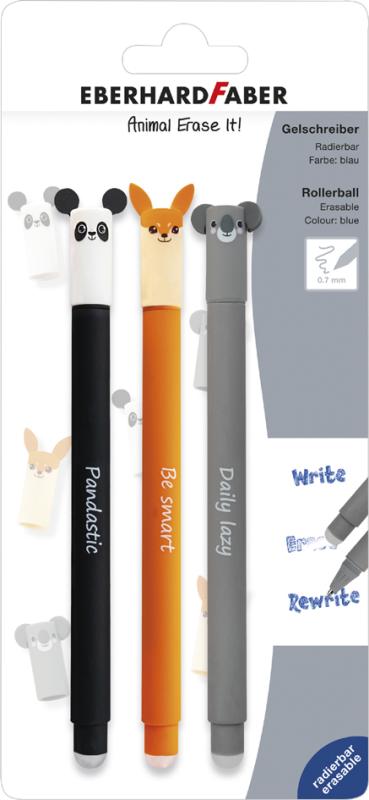 Artikelbeschreibung:Strichstärke: 0,7 mm, nachfüllbar, Schreibfarbe: blau, abnehmbare Kappe mit Tiermotiv, mit der Kunststoffspitze am Gehäuseende kann das Geschriebene wegradiert werden, beinhaltet: 3 Stück (Motiv: Panda, Koala, Fuchs)