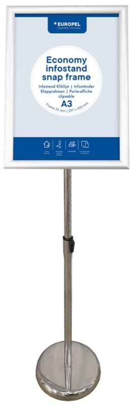 Artikelbeschreibung:Rahmen aus eloxiertem Aluminium, Rahmenprofil 25 mm, mit Gehrungswinkeln und transparenter Antireflexfolie, Standfuß aus Aluminium, Höhe: 800 bis 1.230 mm inkl. Rahmen, geeignet für A4 Format, als Hoch- oder Querformat montierbar