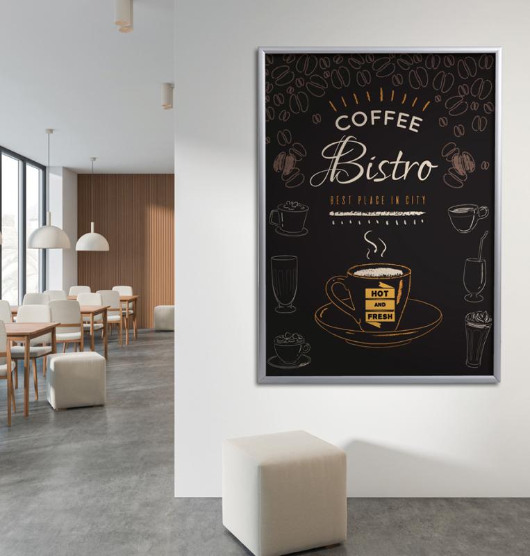 Artikelbeschreibung:aus eloxiertem Aluminium, abgerundetes Rahmenprofil 25 mm, mit Gehrungswinkeln und transparenter Antireflexfolie, Easy-Click-System für schnelles Auswechseln der Dokumente, Lieferung inkl. Befestigungsmaterial