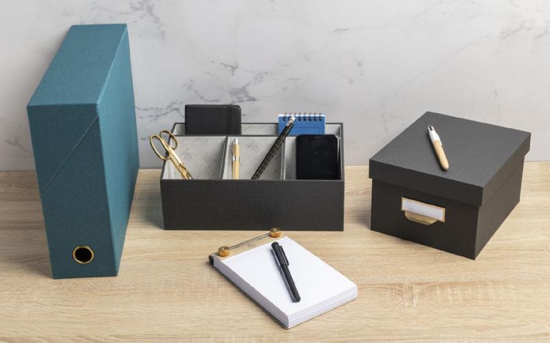 Artikelbeschreibung:aus Recycling-Karton, Papier-Überzug mit Textileffekt, 4 Fächer, Maße: (B)277 x (T)115 x (H)147 mm (68601E)