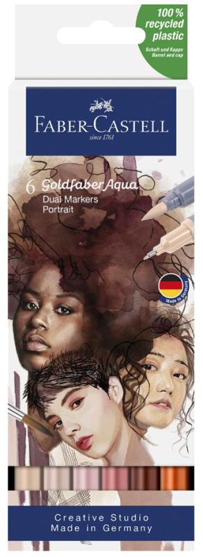Artikelbeschreibung:wasserbasierter Aqua Dual Marker mit zwei Spitzen, weiche flexible Pinselspitze und metallgefasste Finelinerspitze 0,4 mm, wasservermalbar, geruchsneutral, ph-neutral Inhalt: 6 Marker