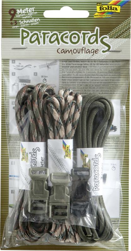 Artikelbeschreibung:Inhalt: 3 Schnüre a 3 Meter, Material: Polyester, Durchmesser: 4 mm, 3 Verschlussklipse/Schnallen aus Kunst- stoff, inkl. Anleitung und QR-Code zum Anleitungsvideo Camouflage-Farben grün und braun