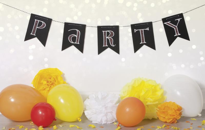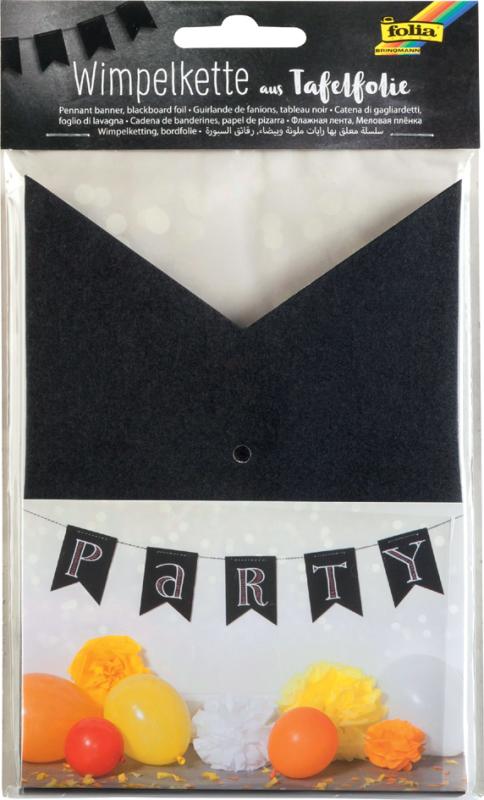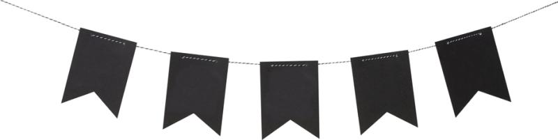 Artikelbeschreibung:14 Wimpel aus Tafelfolie zum Selbstgestalten und Beschriften, Kreide mit Wasser abwischbar, inkl. 3,50 m langer schwarz/weißer Schnur