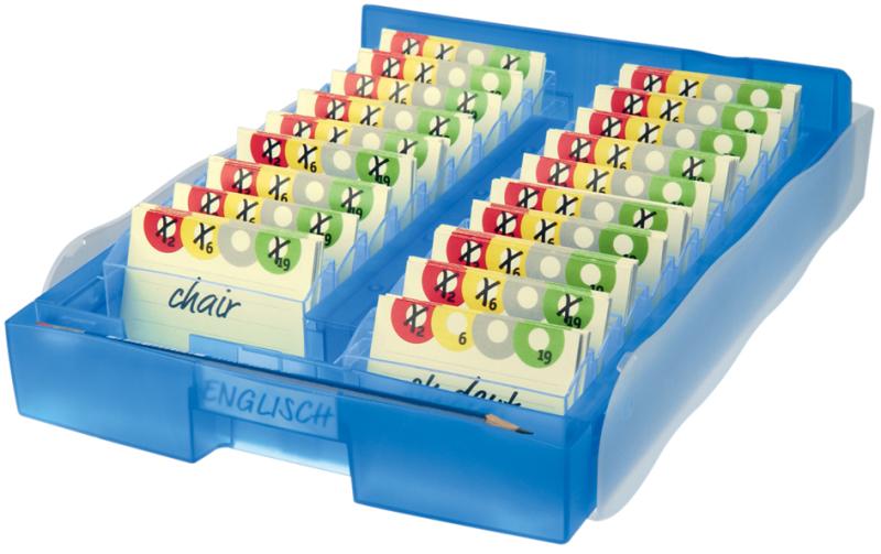 Artikelbeschreibung:Deckel: transluzent-klar, aus Polypropylen, beim Öffnen verschwindet der Deckel unter der Lernkartei, inkl. 100 Karteikarten, 19 Kästchen & 1 Bleistift mit Radierer, für ca. 2.000 Karten, Maße: (B)215 x (T)300 x (H)68 mm (9988-693)