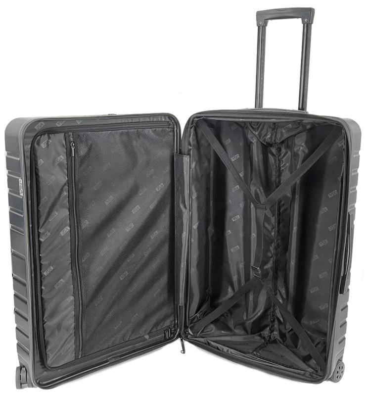 Artikelbeschreibung:arretierbares Teleskoptrolleysystem, Tragegriff, Zahlen- kombinationsschloss, 4 Leichtlaufrollen, Innen: beidseitige Packmöglichkeit durch Packtrennwand & Packgurt, mit Dehn- falte, Maße: (B)505 x (T)290 x (H)755 mm