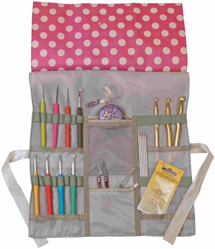 Artikelbeschreibung:unbestückt, zur ordentlichen Aufbewahrung von Häkelnadeln, zum Zusammenrollen, mit Schleife als Verschlussmöglichkeit, 16 Taschen für Häkelnadeln, 6 Taschen für Zubehör, 2 Reißverschlusstaschen, aus Polyester Maße offen: ca. 360 x 550 mm, Maße geschlossen: ca. 130 x 380 mm