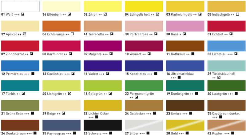 Artikelbeschreibung:auf Wasserbasis, sehr gute Deckkraft, wasserverdünnbar, untereinander mischbar, schnell trocknend, nach dem Trocknen wasserfest, für Innen- und Außenbereich, für Papier, Karton, Leinwand, Stein, Metall, Holz, Leder, Kunststoff, in Tube