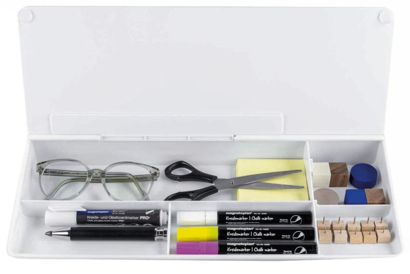 Artikelbeschreibung:aus ABS-Kunststoff, mit weißem Glasdeckel, lässt sich mit Boardmarkern beschreiben, trocken abwischbar, mit 5 unterschiedlich großen Fächern für Stifte, Marker, Schere uvm., Maße: (B)420 x (T)180 x (H)56 mm