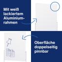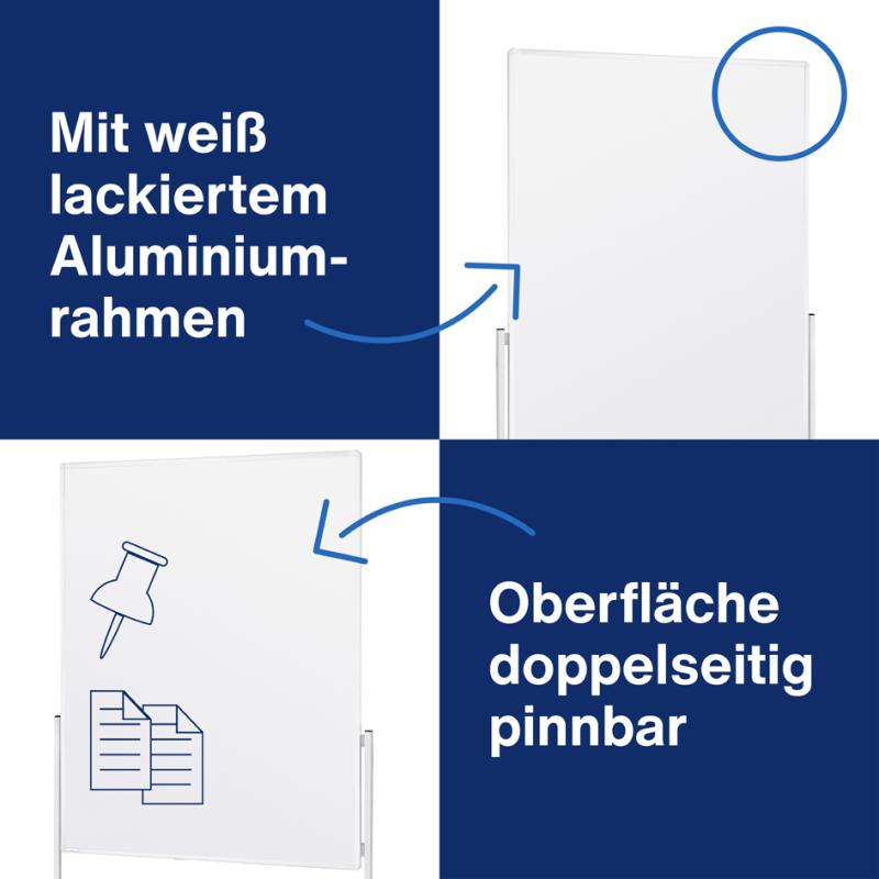Artikelbeschreibung:einteilig, mit weißem Aluminium-Rahmen, doppelseitige Tafel, mit starrem Fußelement, Lieferung inkl. Rollensatz, Karton weiß