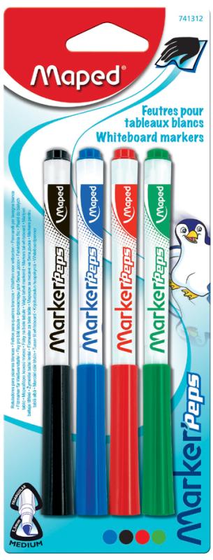 Artikelbeschreibung:Strichstärke: 1,5 mm, Rundspitze, ergonomische Form, trocken abwischbar, Schaft weiß / Schaftfarbe & Kappe in Strichfarbe, farbig sortiert in rot, blau, grün & schwarz, beinhaltet: 4 Marker