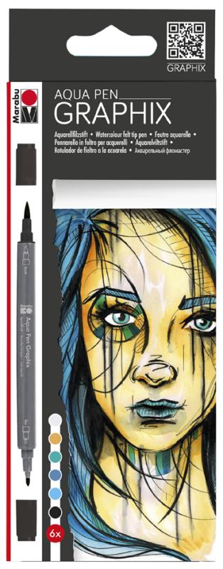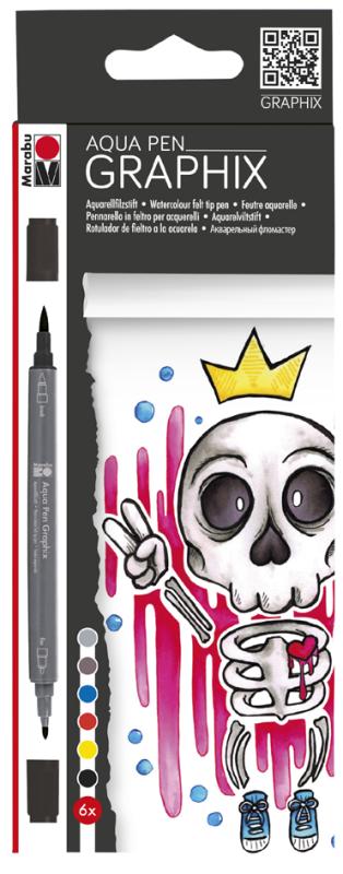 Artikelbeschreibung:wasservermalbar, wasserbasierend, brilliante Farben, lichtbeständig, geruchsarm, Aquarellierbar, Doppelspitze sortiert in den Farben: schwarz, enzian, hellblau, aquagrün, mandarine, hellgrau, 6er Kartonetui (alt: 014500103 / neu: 0145000000103)