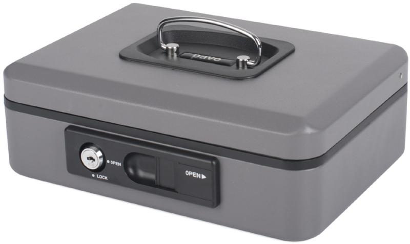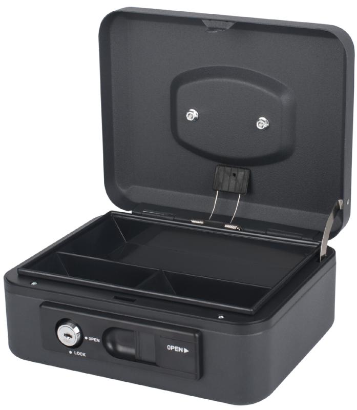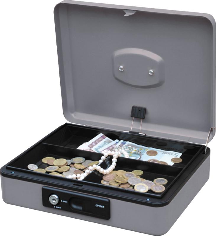 Artikelbeschreibung:aus robustem Stahl, Sicherheits-Zylinderschloss mit 2 Schlüsseln, mit automatischer Öffnung durch Druckknopf, dreifach unterteilter Münzgeldeinsatz aus Kunststoff, versenkbarer Tragegriff