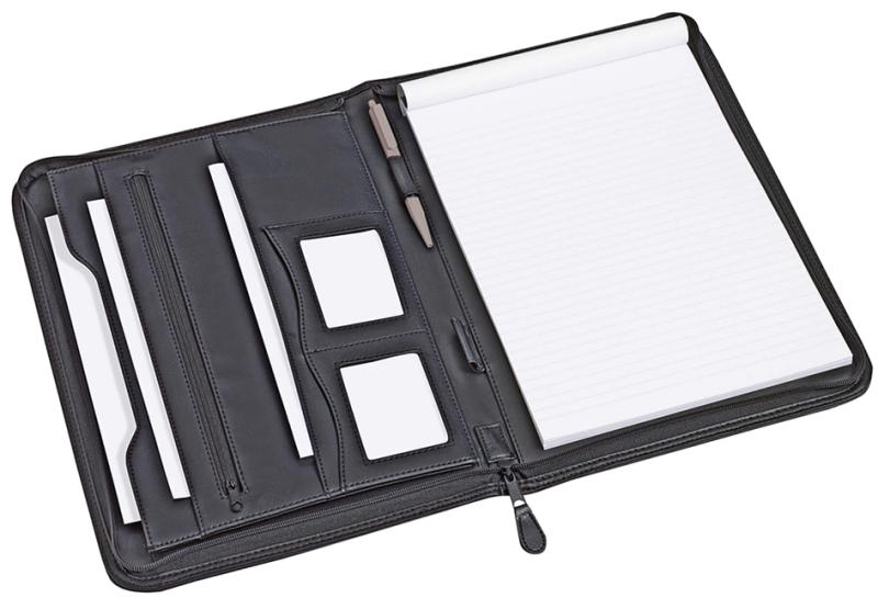 Artikelbeschreibung:Kunstleder, mit umlaufendem Reißverschluss, Einsteckfächer für A4 Dokumente, mit Reißverschluss verschließbares Einsteckfach, 2 Stiftschlaufe, DIN A4-Schreibblock mit 50 linierten Blättern, Maße geschlossen: (B)250 x (H)360 mm