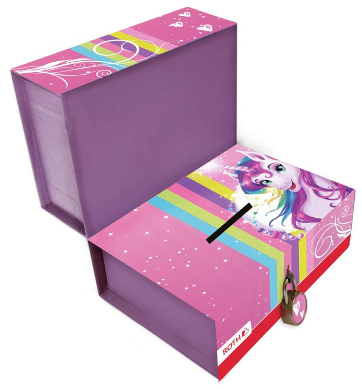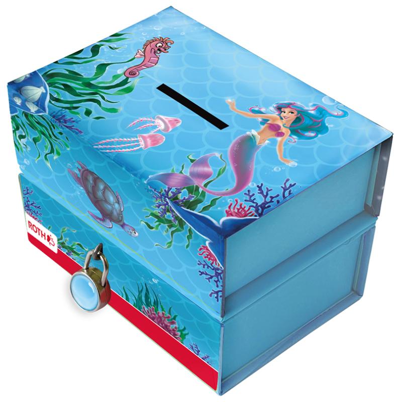 Artikelbeschreibung:2 getrennten Boxen, für kurz- und langfristige Sparziele, obere Box mit Magnetöffnung, untere Box mit Schloss, kaschierte stabile Pappe, Maße: (B)110 x (T)80 x (H)110 mm