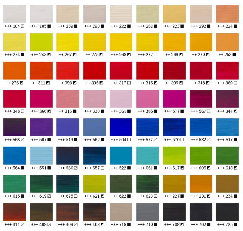Artikelbeschreibung:kurze Trocknungszeit, mit Wasser verdünnbar, mittlere Viskosität, hochwertige Pigmente, Kunststofftube beinhaltet: 72 Tuben