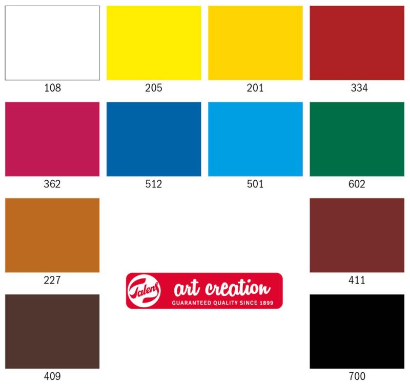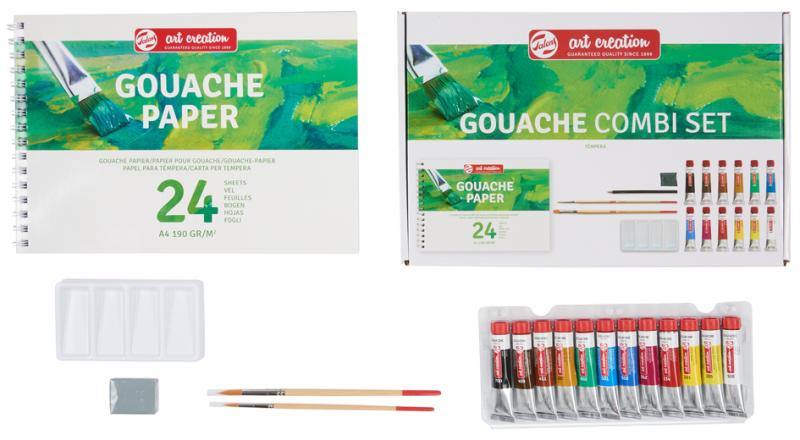 Artikelbeschreibung:Set bestehend aus: 12 x 12 ml Gouache farbig sortiert, 1 Papierblock A4, 2 Pinsel, Mischschälchen, Farbstift und Knetgummi (9011613M) sortiert in den Farben: weiß, zitronengelb, hellgelb, scharlach, dunkelrosa, kobaltblau, hellblau, dunkelgrün, gelber ocker, siena gebrannt, umbra gebrannt