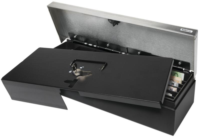 Artikelbeschreibung:8 Münzfächer / 6 Geldscheinfächer - herausnehmbar, Einwurfschlitz an der Vorderseite, geprägter Metall-Klapp- deckel, elektrische Öffnung und Öffnung mit Schlüssel, Stahlgehäuse, Maße: (B)460 x (T)170 x (H)100 mm (132-0498 / alt: 123-0434) RJ12 Anschluss für Quittungsdrucker und Registrierkassen