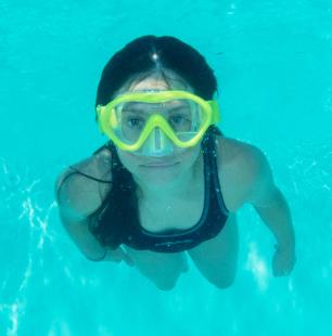 Artikelbeschreibung:großes Sichtfeld, Silikon-Maskenkörper, textiles Band aus Nylon, Polyester und Latex, speziell für Kinder entwickelt