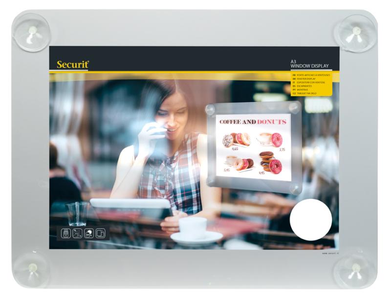 Artikelbeschreibung:doppelseitige, transparente Halterung, witterungs- und UV-beständig, Anbringung mittels 4 Saugnäpfen, Maße: (B)270 x (H)360 mm (PFW-A4-BL)
