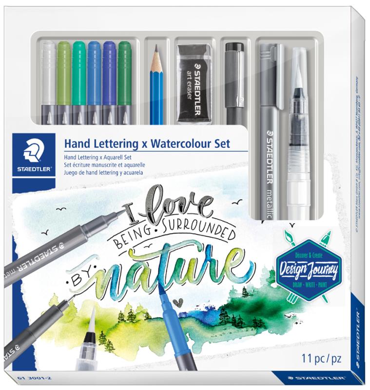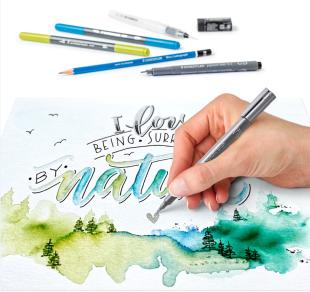 Artikelbeschreibung:Inhalt: 6x Doppel-Fasermaler mit Pinselspitze (3001), 1x Pigmentliner, schwarz, Strichstärke: 0,5 mm, 1x Bleistift Mars Lumograph (100-2B), 1x Radierer, 1x Metallic brush pen (8321-81), 1x Wassertankpinsel (61 3001-2) aus der Serie Design Journey, Maße: (B)205 x (T)20 x (H)195 mm