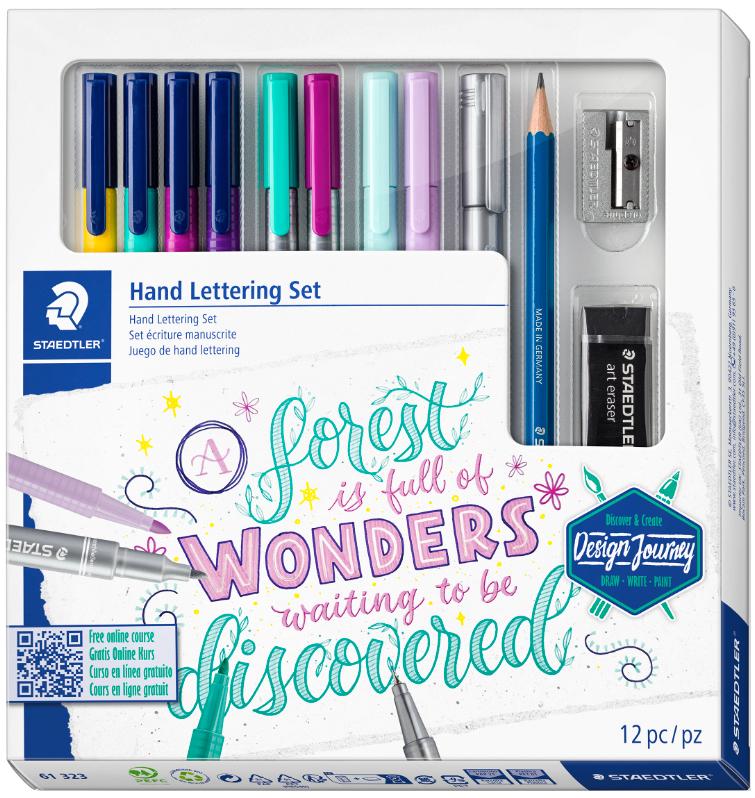 Artikelbeschreibung:zum Anfertigen von ausdrucksstarken Handlettering-Motiven, Inhalt: 2 Fineliner, 4 Fasermaler, 2 Textmarker, 1 Metallic-Marker, 1 Bleistift 100-Hb, 1 Spitzer, 1 Radierer & Anleitung (61 323)