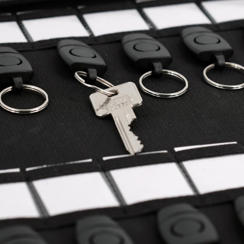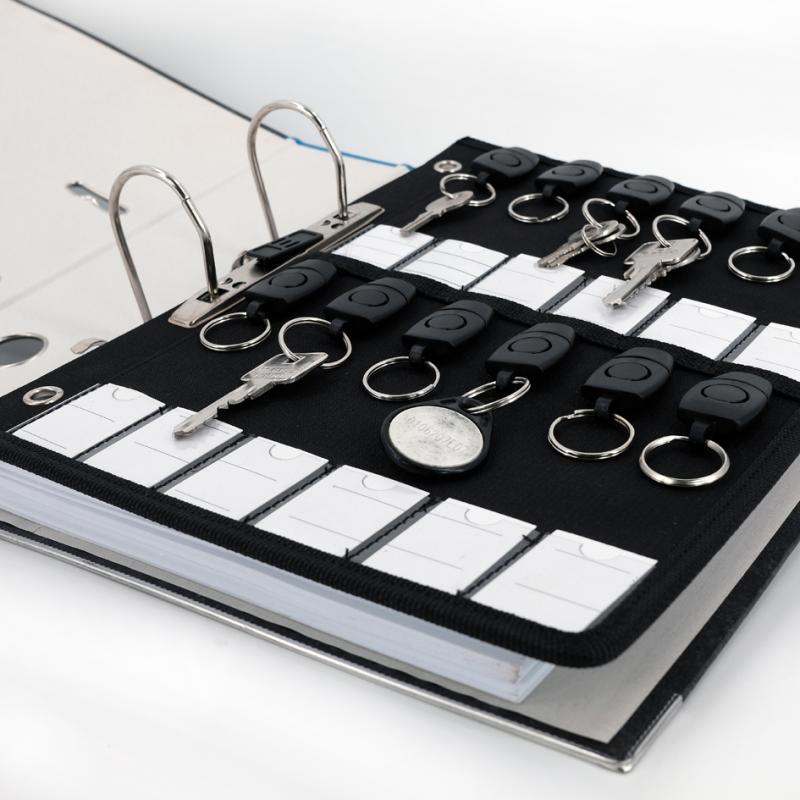 Artikelbeschreibung:aus recyceltem PET, mit 12 abnehmbaren Schlüsselringen & 12 Beschriftungsfächern, Lochung 80-80-80 mm, Lochverstärkungsringe aus Metall, Maße: (B)235 x (T)10 x (H)310 mm