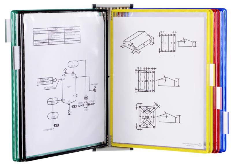 Artikelbeschreibung:bestückt, aus Stahlblech, lichtgrau mit 4 Anschlagstoppern, Lieferung inkl. 5 Drehzapfentafeln, DIN A4, sortiert in den Farben: blau, rot, gelb, grün und schwarz