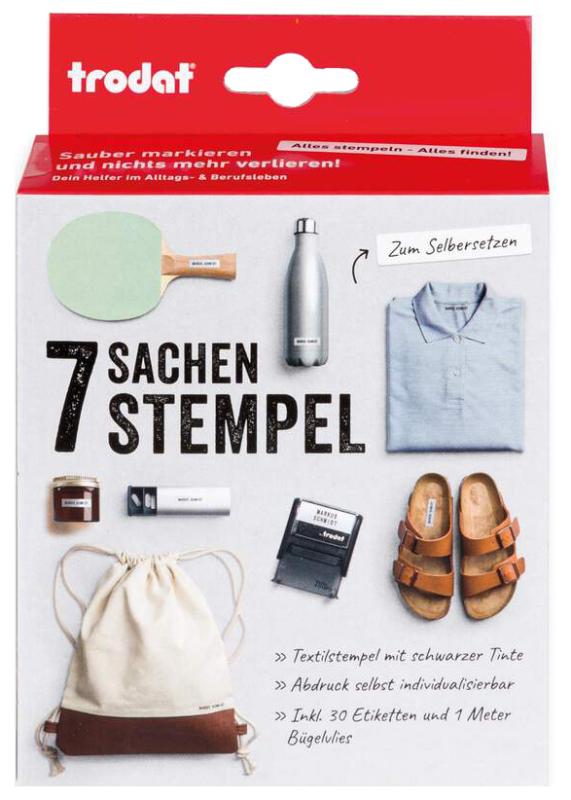 Artikelbeschreibung:Stempel zum Selbersetzen, Abdruckmaße: 37 x 13 mm, Inhalt: 1 Stempel, 1 Buchstaben- und Zahlenset mit 8 Motiven (Schrifthöhe 4 mm), 1 Kissen schwarz, 1 Pinzette, 30 Etiketten in 2 Größen und 1 Meter Bügelvlies