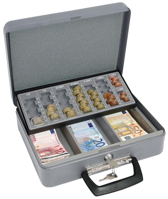 Artikelbeschreibung:- für den Markt: D / F / NL / A / L - pulverbeschichtet, mit Koffertragegriff, für Münzen und Banknoten, Münzgeldkapazität: 137,60 EUR, Zylindersicher- heitsschloss inkl. 2 Schlüsseln, Geldscheinmulde mit 3 Bank- notenfächern, Maße: (B)300 x (T)240 x (H) 90 mm (149 658012)