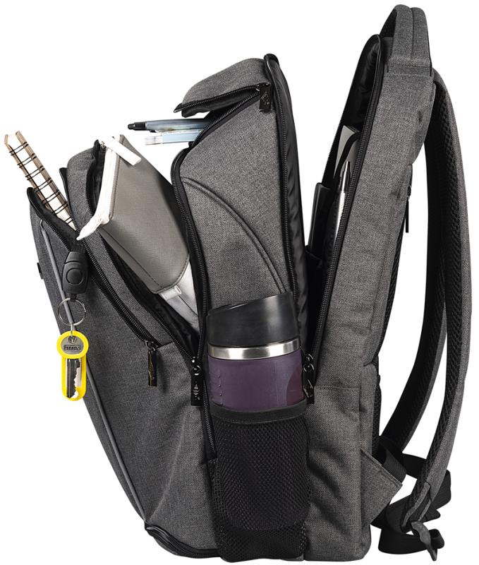 Artikelbeschreibung:aus Polyester, für Notebooks bis 15,6` (39,62 cm) sowie Tablets bis 10,5` (26,67 cm), 2 gepolsterte Innentaschen, mit Reißverschluss, mit Deckeltasche & Bodenfach, rück- seitiges Reißverschlussfach, Organisations-Fronttasche Maße: (B)330 x (T)200 x (H)510 mm, Volument: 28 Liter, 2 seitliche Netzfächer, Trolleygurt, gepolsterte Schulter- gurte verstellbar, atmungsaktives Rückenpolster, verstärkter Boden, mit Tragegriff