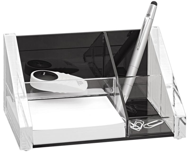 Artikelbeschreibung:aus Acryl, mit Zettelbox inkl. 150 Blatt weiße Notizzettel (9 x 9 cm), 1 Stiftfach & 2 Sammelfächer, transparente Gummifüße für möbelschonenden, rutschfesten Stand, Maße: (B)164 x (T)97 x (H)89 mm, im Geschenkkarton (60 5101)